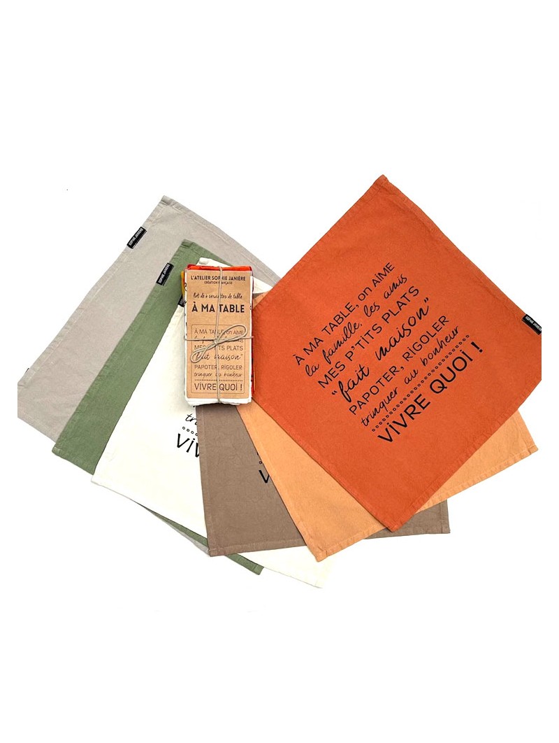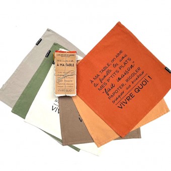 6 napkins in 6 different colors with the same text: A ma table, on aime la famille, les amis, mes p'tits plats faits maison, papoter, rigoler, trinque au bonheur, vivre quoi!