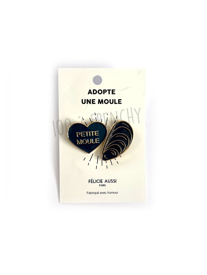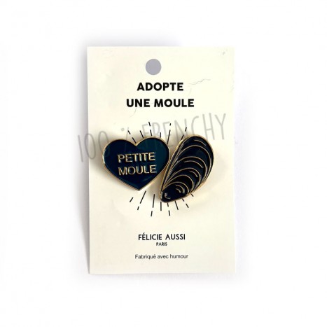 Two small enamel pins, one in the shape of a mold, and the second in the shape of a black heart. To give to your best friends, your sweetheart, your little mussel!