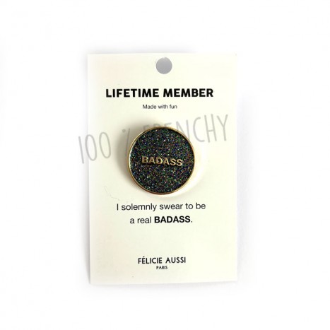 A small round pin in glittery black enamel with a trashy, offbeat sense of humor, to give to all the badass women you know