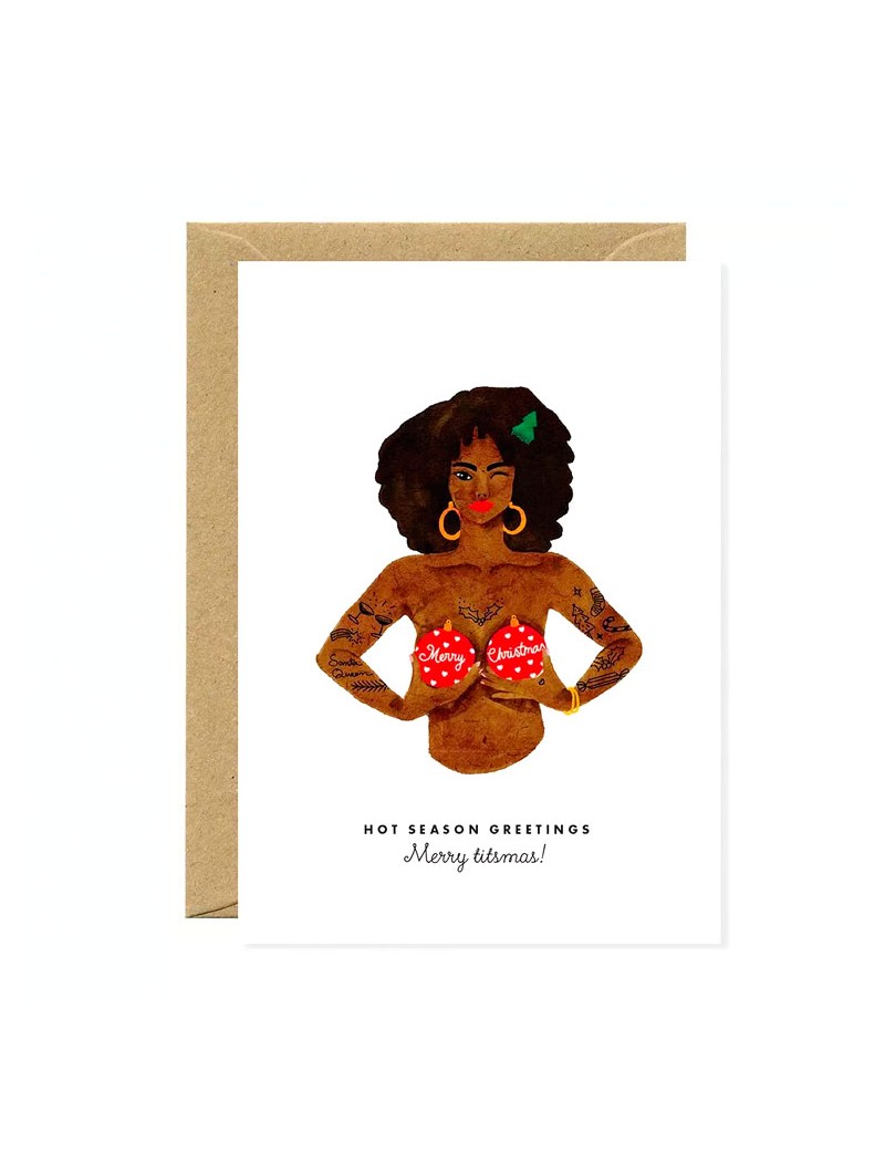 Text in English: Merry Titsmas. Hot seasons greetings)