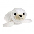 White seal plush hot water bottle filled with wheat grains and lavender flowers.