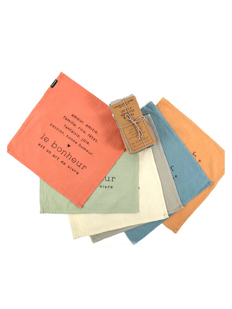 6 serviettes de 6 couleurs différentes, avec une inscription identique : amour, amitié, famille, rires, fête, fantaisie, joie, passion, bonne humeur, le bonheur est un art de vivre